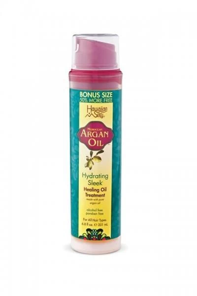 Hawaii Sliky Argan Oil Hydrating Sleek Healing Oil Treatment 201 ml: Hawaiian Silky Argan Oil Hydrating Sleek Healing Oil Treatment is enriched with fatty acids, vitamin E and proteins to promote healing and provide nourishment to over-processed hair damaged by environmental factors, styling tools, color and chemical procedures.