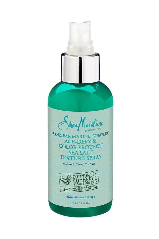 Shea Moisture Age-Defy and Color Protect Sea Salt Texture Spray 118 ml: a weightless sea salt styling spray infused with our exclusive marine extract complex including Carrageenan (Red Algae) provides beachy waved texture, definition and a light hold. Leaves hair with a sexy, naturally tousled look and feel.